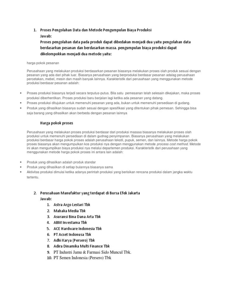 Bahan baku langsung , yaitu biaya bahan yang dapat dilacak ke produk, seperti baja dalam produk mobil tenaga kerja langsung , merupakan upah dan tunjangan tambahan yang diperoleh oleh individu yang secara fisik terlibat dalam mengubah bahan baku menjadi output. Bahan penolong adalah bahan yang tidak menjadi bagian produk jadi atau bahan yang meskipun menjadi bagian produk jadi tetapi nilainya relatif kecil bila dibandingkan dengan harga pokok produk 21 tersebut. Sedangkan untuk biaya tidak langsung yaitu biaya gabungan dari biaya … 09.11.2015 · unsur biaya produksi dapat dikelompokkan menjadi 3 (tiga) elemen, yaitu: Tenaga kerja langsung, adalah tenaga kerja yang digunakan dalam merubah atau mengkonversi bahan baku menjadi produk selesai dan …